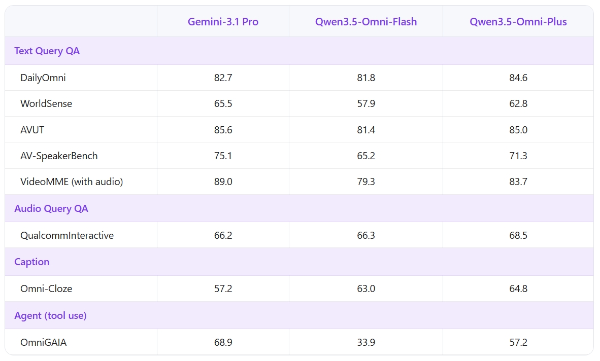 On benchmarks, Alibaba claims Qwen3.5-Omni outperforms Gemini 3.1 Pro on general audio understanding, reasoning, and translation tasks, while matching Google’s model on audio-visual comprehension.