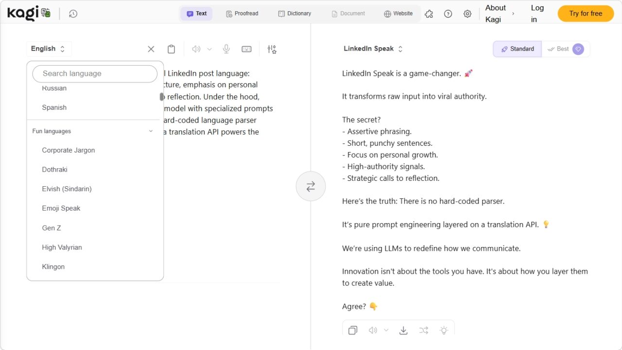 Kagi Translate Goes Viral with “LinkedIn Speak” As Output Language